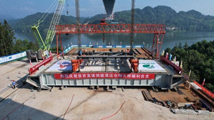 海报新闻记者从交通运输部获悉,8月3日,湖南省在建跨径最大的悬索桥——张官高速洞庭溪沅水特大桥顺利合龙,为2026年全线通车奠定了坚实基础。