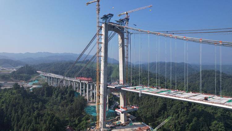 据介绍,洞庭溪沅水特大桥位于湖南怀化市沅陵县境内,跨越沅水下游五强溪水库和五强溪国家湿地公园,全长1707米,主桥设计为跨径800米双塔单跨悬索桥,是G59呼北高速(呼和浩特至北海)张家界至官庄段(简称“张官高速”)的关键控制性工程,由湖南建投集团旗下湖南路桥建设集团承建。自2022年9月正式开工以来,项目建设团队克服复杂地质条件和生态保护要求,推行“设计—制造—采购—建造”的生产贯通模式,形成了大桥全产业链上下游的分工协作联动机制,采用智能化施工技术高效推进绿色建造。