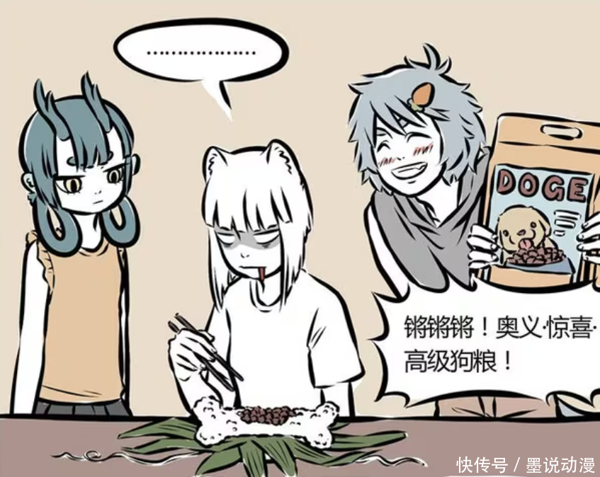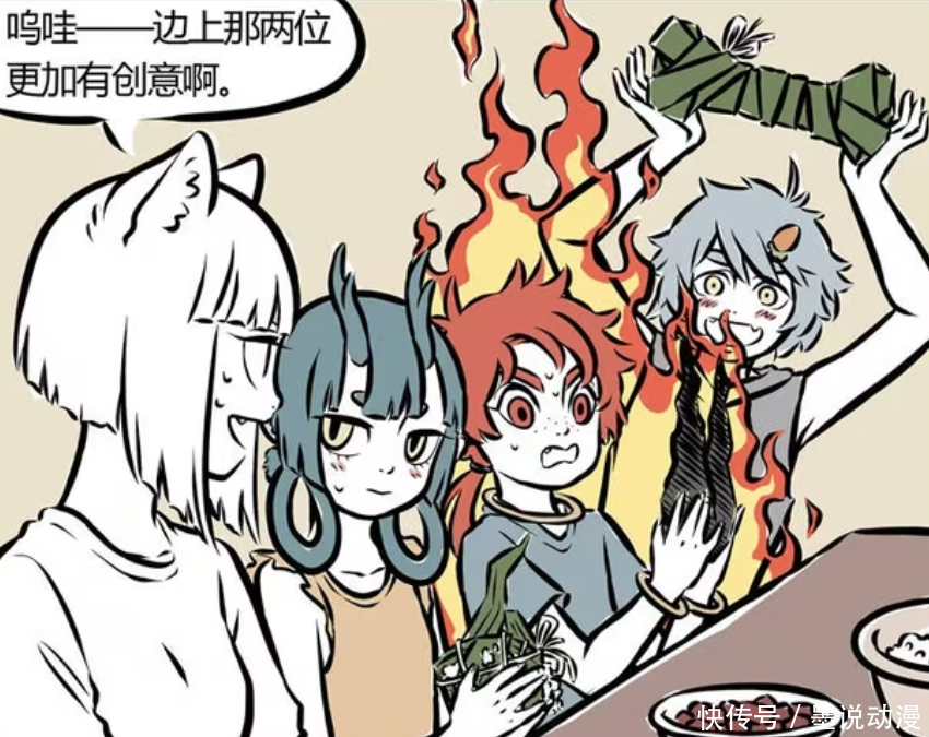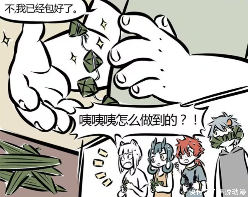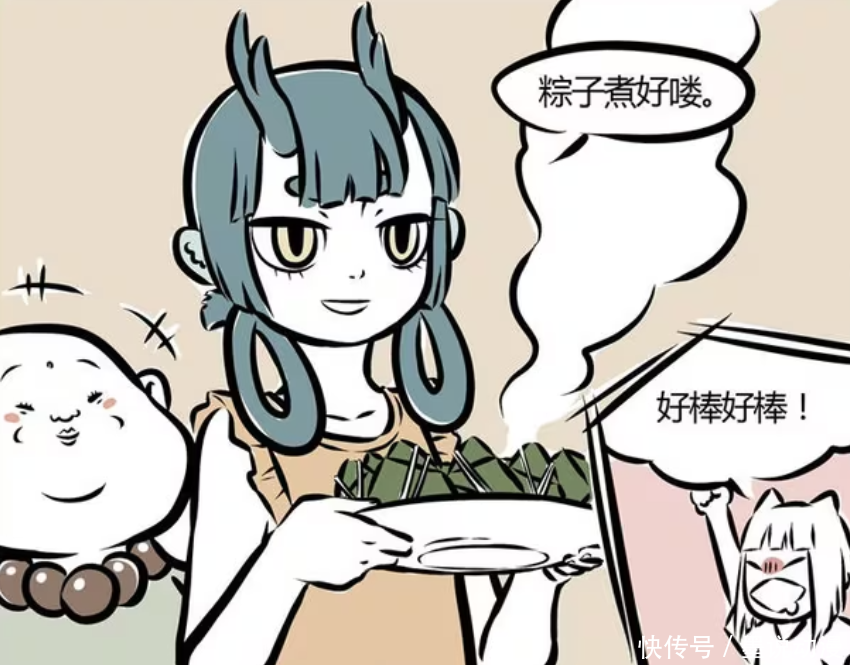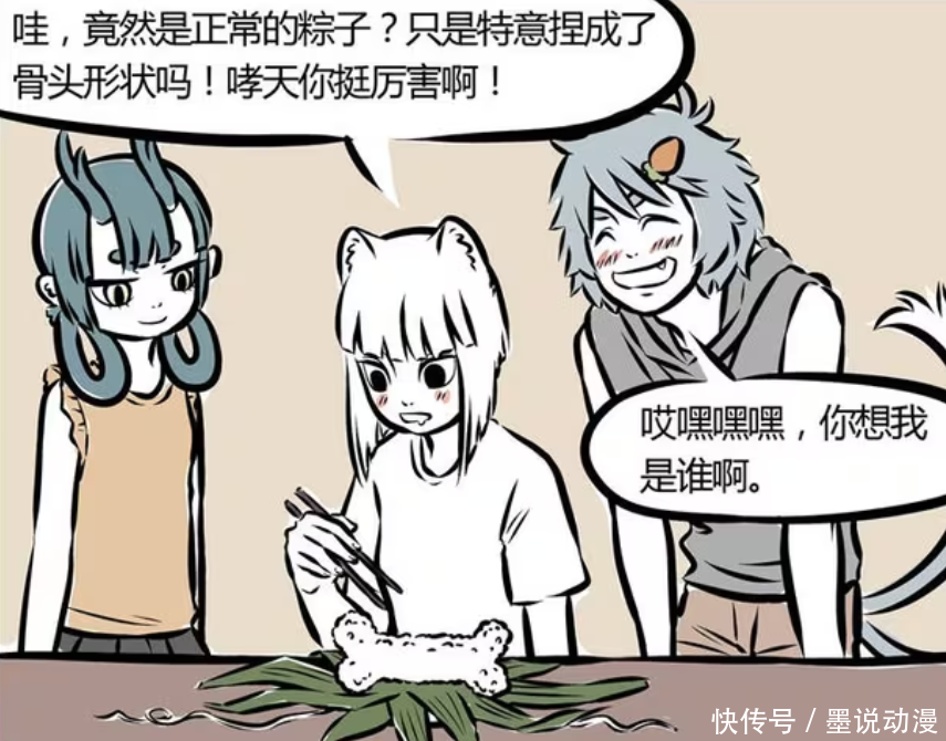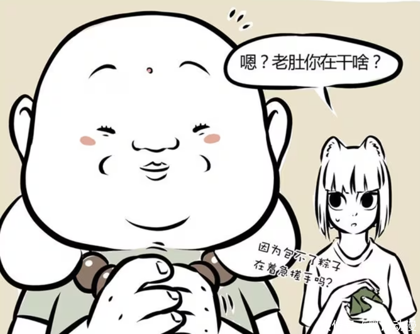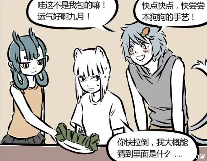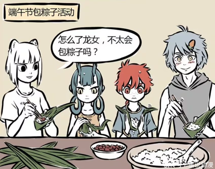 《非人哉》漫画版,一到传统节假日,主角们就会各显身手。端午节到来之际,九月会带着龙女、红孩儿、哮天和老肚包粽子。可以看出龙女和红孩儿都不太会包粽子,哮天包的粽子也比较特殊。原本不被看好的老肚,没想到手艺那么好。至于哮天,包的是狗粮粽,一般人吃不了。